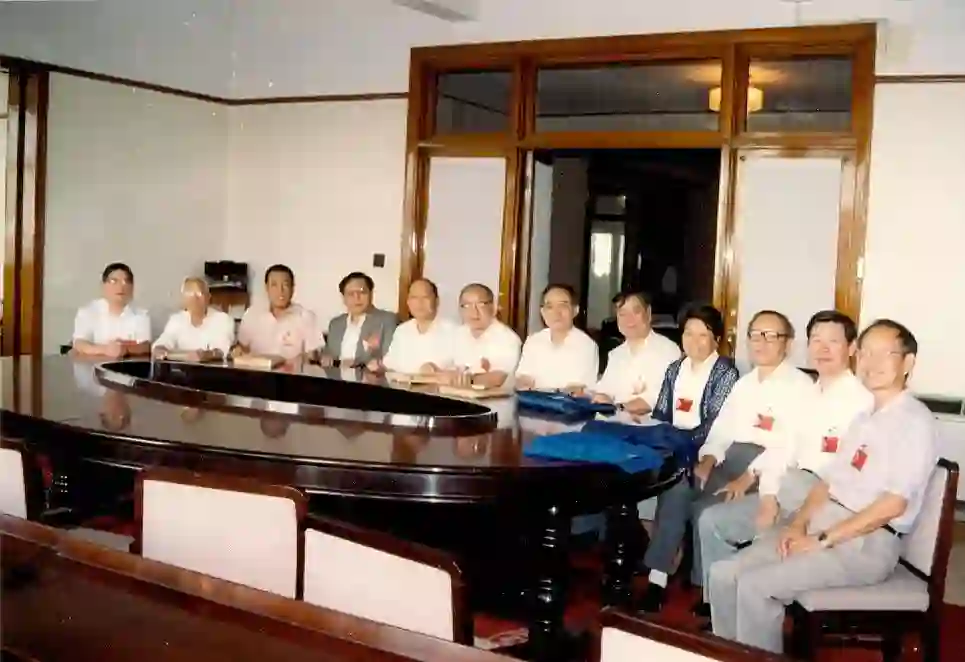 1990年国务院学位委员会地质地球物理学科组会议,右起:汪品先、谢先德、刘本培、薛祥熙、施央申、孙枢、王德滋、钱祥麟、欧阳自远、张贻侠、曾融生、徐世浙。