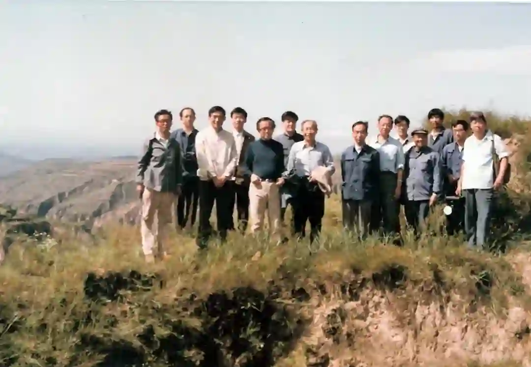 1983年观察黄土高原地貌,左起:李继亮、邵兴亚、孙枢、顾兆炎、许靖华、陈海泓、刘东生、当地同志、吴子荣、韩家懋、陈明扬、丁仲礼、崔久旭、高福清。