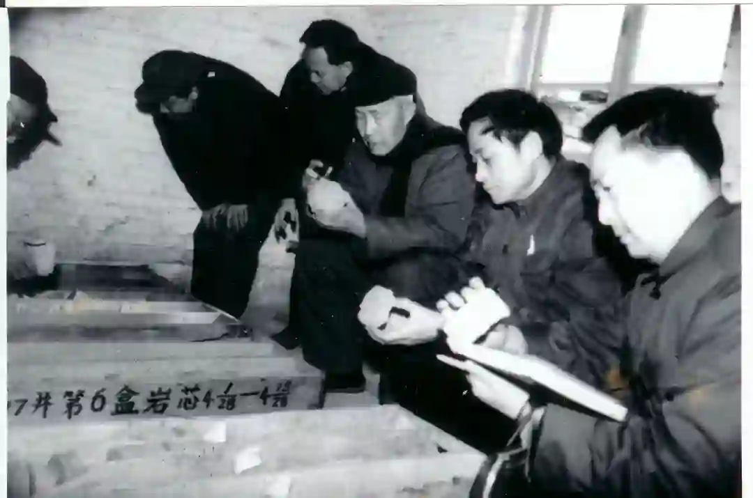 1980年初在中原油田观察岩芯,左三:张文佑、右二:孙枢。