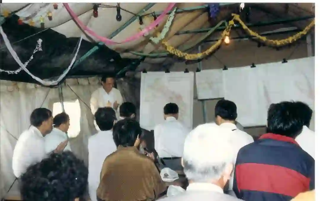 受国家科委委托,地学部对新疆305项目进行评估考察与咨询(1993),在新疆西准帐篷里同当地地质队讨论305项目有关课题的进展情况。