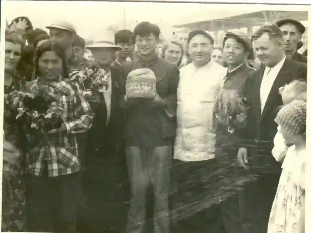 在苏联境内考察时受到当地人民的热烈欢迎,按当地习俗赠送大面包,上面书写着“友谊”(俄文),左侧持花束者是杨红(女)。