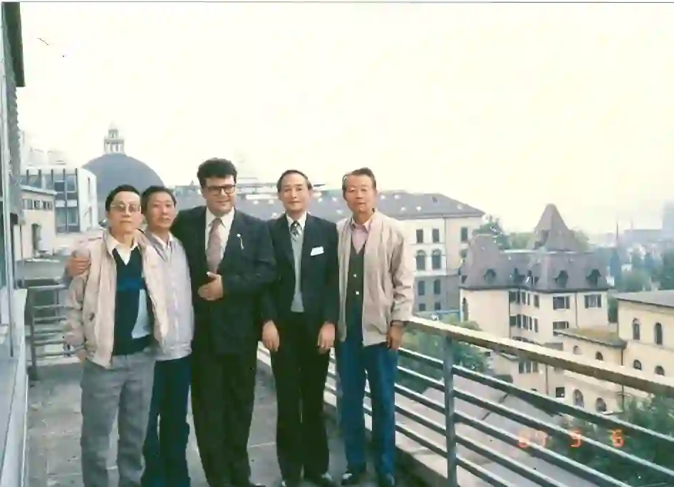 在瑞士苏黎世理工大学(1989),左一:周新华、左三:辛格(土耳其)、右二:孙枢、右一:徐树桐。