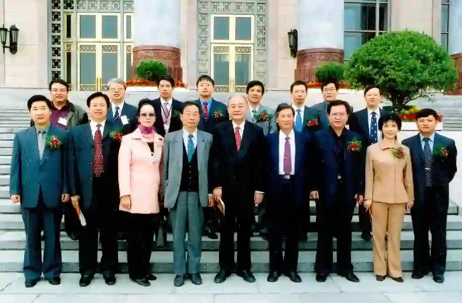 黄汲清青年地质科技奖评选出首届获奖人(2002),第一排获奖者:左一刘传虎、左二王宜林;右一黄润秋、右二邱燕(女)、右三吴永平的代表;第二排右一高抒、右三至六杨振宇、丁仲礼、唐建明、王驹。黄汲清基金工作人员,第一排左三至六王弭力、王泽九、孙枢、陈毓川;第二排左一至二王宗起、艾永德,右二禹启仁。