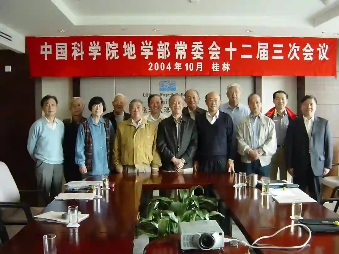 中国科学院地学部常委会(2004,桂林),左起:安芷生、张国伟、张弥曼、袁道先、叶大年、戎嘉余、苏纪兰、孙枢、陈顒、高俊、童庆禧、郑度、沈保根。