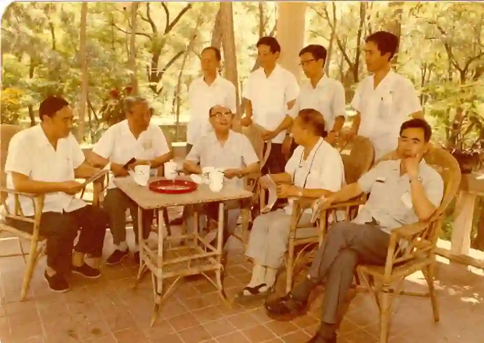 1982年中国地质学会成立60周年庆祝会(北戴河)期间。黄汲清理事长(中坐)同老地质学家以及部分正副秘书长讨论会议安排。右:涂光炽、李春昱;左:马杏垣、孙殿卿;后排左起:姚培慧、孙枢、王泽九、李廷栋。