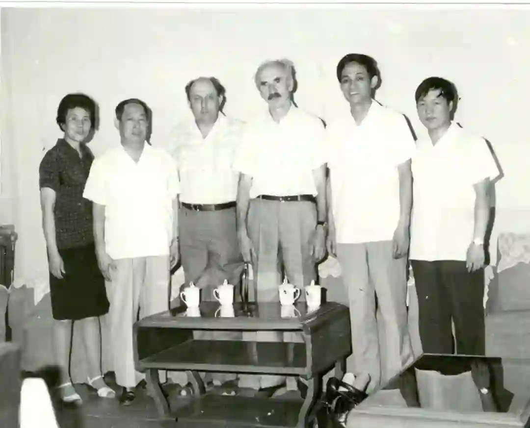 1980年初在地质研究所会见苏联科学院谢格洛夫通讯院士(左三)和伊林教授(右三),左一:杨淑珍、左二:吴利仁、右一:赵秋波、右二:孙枢。