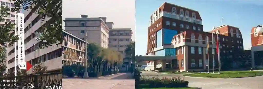 国家自然科学基金委员会,左图为中央音乐学院办公地址(1986-1991);中图为花园路办公地址(1991-1999)右图为现办公地址,双清路83号(1999-至今)。