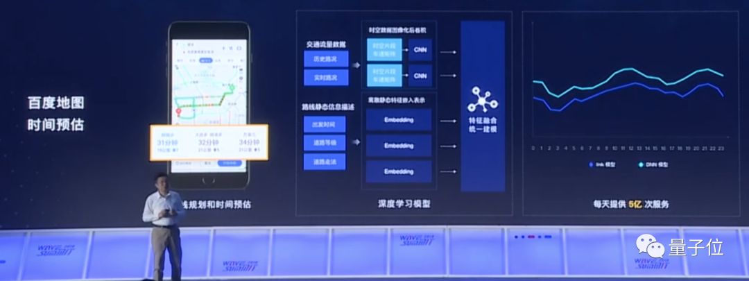 王海峰说,百度地图每天提供大约5亿次时间预估,每一次都是深度学习在背后起作用。