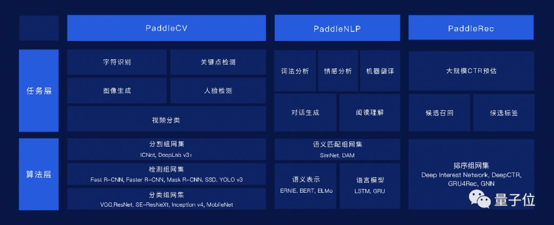 在核心框架层,飞桨在模型库中发布了用于NLP和视频理解的新工具集,还在训练和预测环节更新了众多功能,工具组件层有三款新品发布。