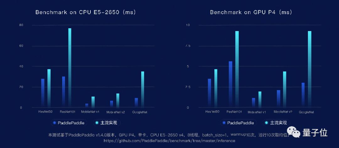 在Benchmark上可以看出,在英特尔的至强处理器上、P4 GPU上,飞桨的推理引擎都做了很好的优化。