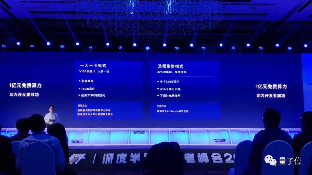基于免安装的集成环境AI Studio,百度为开发者提供了总共1亿元的免费算力。算力的发放有两种方式,一种是人手一张V100训练卡,用户通过邀请码获取AI Studio平台上的免费算力时长,还能邀请好友获得更多时长;另一种是远程集群模式,只要登录AI Studio就能通过这种方式免费使用单卡12GB显存的算力。
