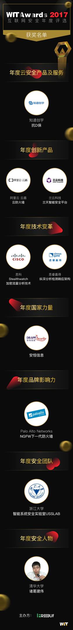 本次WitAwards 2017评选全程历时三个多月,收到近500项申报及提名,共有74席入围项目。组委会更是邀请了63位来自国内安全厂家、企业安全部门、政府相关单位、研究机构、行业协会、专业媒体的信息安全知名专家和学者组成专家评委团队,全方位、多角度综合分析、公正评判每一个参评对象。最终评选出7个年度奖项,诞生9个获奖者: