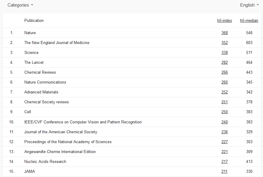 具体来说,该榜单采用的 h 指数包含两种:h5-index 和 h5-median,前者是指在过去整整 5 年中所发表文章的 h 指数,它是一个最大值,即 2014-2018 年间发表的 h 篇文章每篇至少都被引用过 h 次的最大值(例如,某杂志共发表 5 篇论文,分别被引用 18,10,6,3 和 2 次,那么这份杂志的 h 指数就是 3)。后者是指组成其 h5-index 的文章的被引用量的中位数。