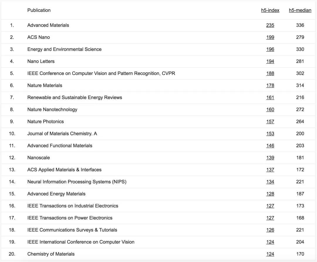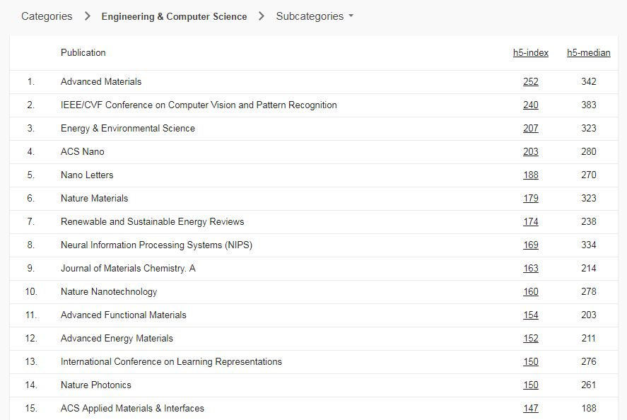 Google Scholar Top Publications 榜单从某种维度上反映了各大学术期刊和会议的影响力,以 h 指数(h-index)作为评判标准。h 指数是一个混合量化指标,可用于评估研究人员的学术产出数量与学术产出水平。