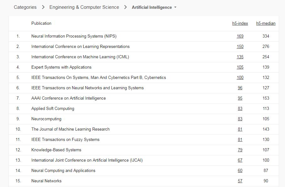 如下图所示,在人工智能子类排名中,神经信息处理系统大会(NeurIPS)、国际学习表征会议(ICLR)和国际机器学习会议(ICLM)位列前三名。