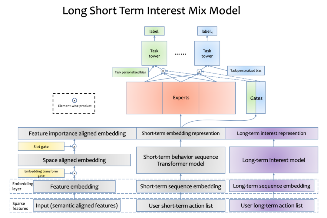 针对快手的业务特点,快手推荐团队对于用户长期兴趣也进行了建模,使得模型能对于用户长期的历史记录都有感知能力。快手推荐团队发现,将用户的交互历史序列(播放、点赞、关注、转发等)扩长之后,模型能够更好的捕捉到一些潜在的用户兴趣,即使此类行为相对稀疏。针对该特点,推荐团队在之前的模型基础上设计并改进了用户超长期兴趣建模模块,能够对用户几个月到一年的行为进行全面的建模,用户行为序列长度能达到万级。此模型已经在全量业务推全并且取得了巨大的线上收益。