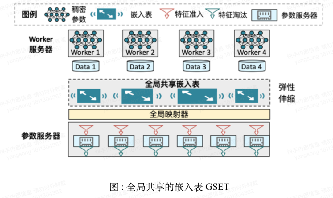 为了支撑推荐场景下千亿特征模型的在线训练和实时预估,推荐团队针对训练框架和线上预估服务的参数服务器 (Parameter Server) 进行了修改。在推荐模型的在线学习中,存储 Embedding 的参数服务器需要能够精准的控制内存的使用,提升训练和预估的效率。为了解决这一问题,推荐团队提出了无冲突且内存高效的全局共享嵌入表(Global Shared Embedding Table, GSET)的参数服务器设计。