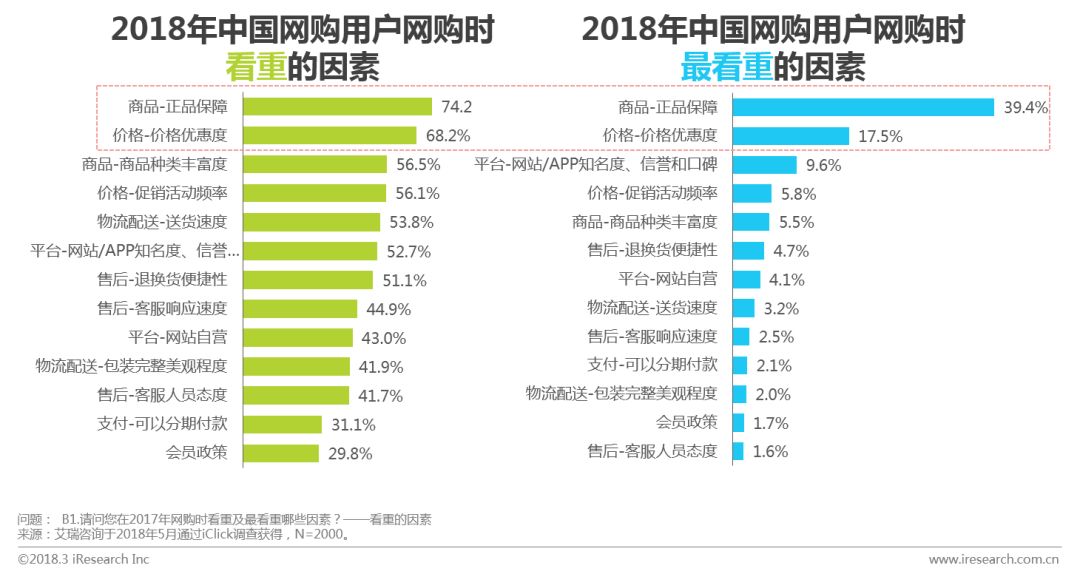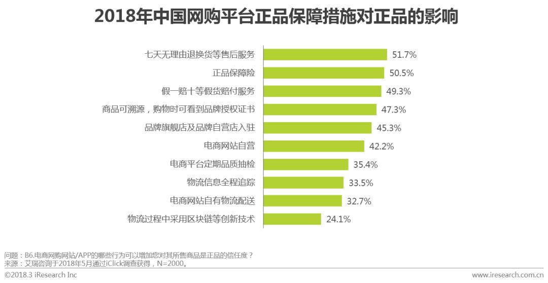 艾瑞调研数据显示,商品的售后赔付服务更能增加用户对平台所售卖商品是正品的信任度,其中七天无理由退换货等售后服务占比51.7%,假一赔十等假货赔付服务占比49.3%;商品是否有正品保障险也是影响用户对正品信任度的主要因素之一;随着消费升级,消费者网购早就由以前一味关注价格便宜、升级为注重商品品质。商品授权、正品保障险、售后保障服务是消费者选择网购平台的最主要因素。