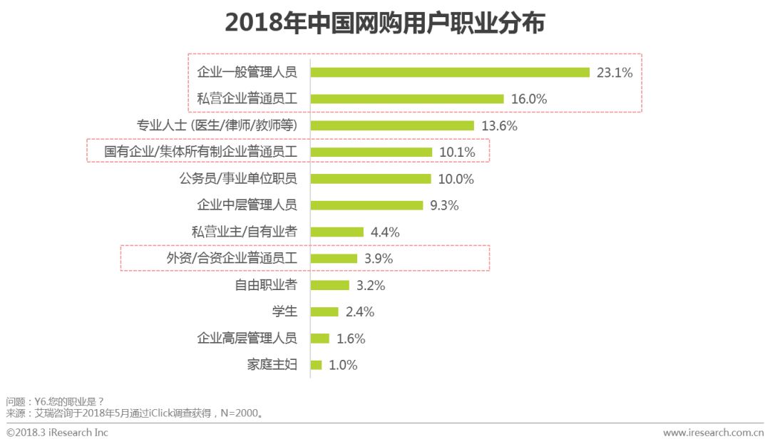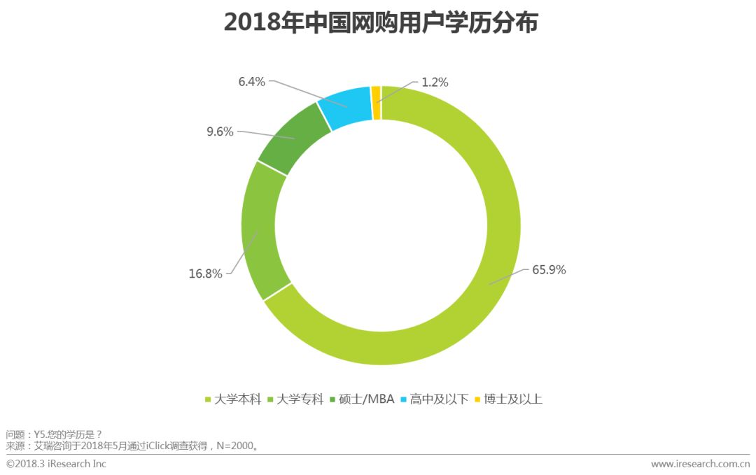 艾瑞调研数据显示,大部分网购用户学历较高,大学本科及以上学历占比76.7%,其中大学本科学历占比65.9%,为网购用户中主要消费人群,硕士及以上学历占比10.8%。在以职业划分的人群中,企业一般员工占比53.1%,企业中高层管理人员占比10.9%,专业人士占比13.6%,从职业划分角度来看,白领为主要消费人群。