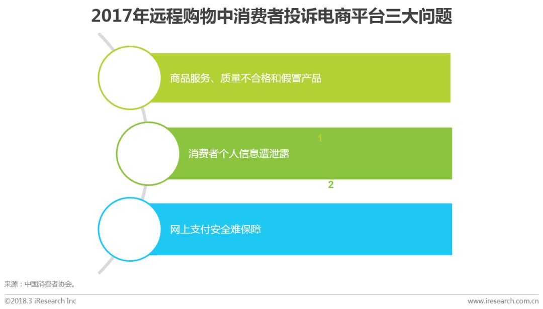 在远程购物中,消费者投诉的对象主要涉及电商平台、以微商为代表的个人网络商家和电视购物等。其中电商平台被投诉的三大问题为:一是商品服务、质量不合格和假冒产品问题;二是消费者个人信息遭泄露;三是网上支付安全难保障。网络售假为各大电商亟待解决的痛点。