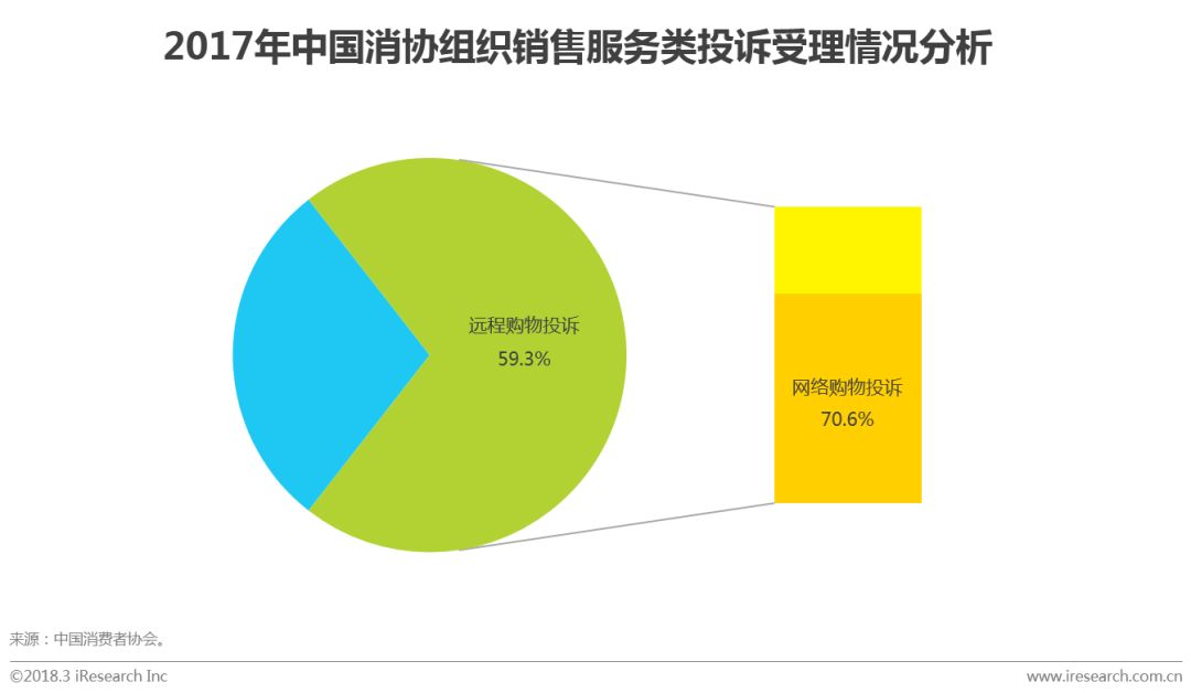 根据中国消费者协会最新数据,2017年全国消费者协会组织共受理销售服务类投诉69397件,其中远程购物为投诉最多的领域,占比达59.3%;而远程购物中以网络购物投诉为主,占远程购物投诉的70.6%。