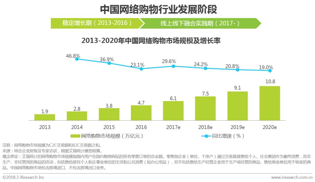 近年来,随着移动支付、消费金融、物流仓储等基础设施的发展,市场容量巨大但增速逐渐放缓、渠道建设迅速并快速成熟已成为当前网购市场的重要特征,提升商品质量进行渠道升级将成为网络购物下一阶段的发展方向。