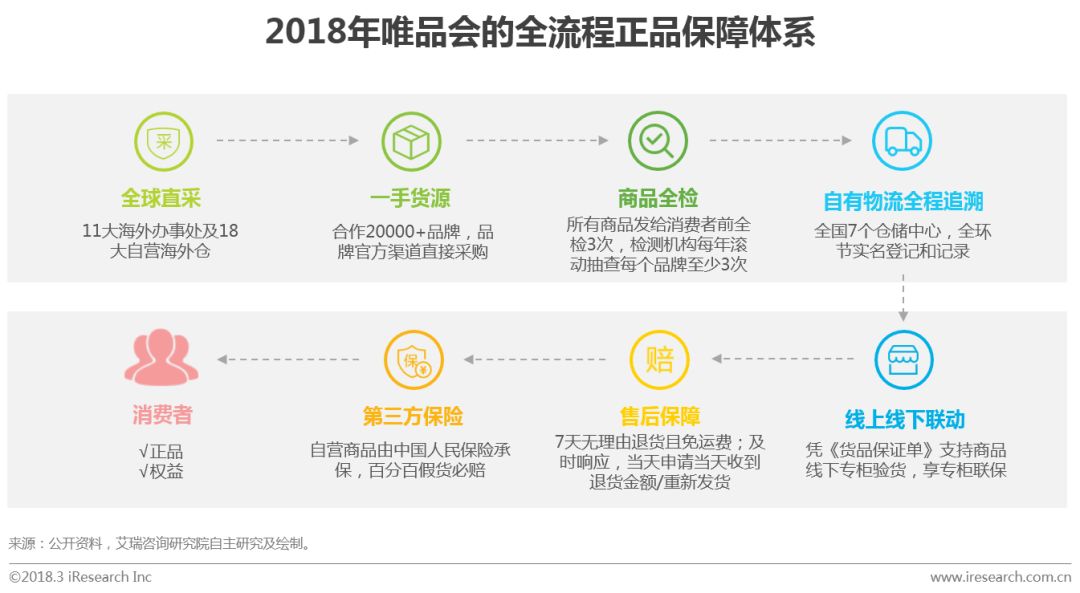 正品保障是消费者网购体验中的重要部分,也是唯品会重要的战略资产。唯品会在中国开创了“名牌折扣+限时抢购+正品保障”的创新电商模式,并持续深化为“精选品牌+深度折扣+限时抢购” 的正品特卖模式。借助自身的自营模式和物流等基础设施,唯品会构建了一套完整的体系,实现从源头到消费者的全流程正品保障。