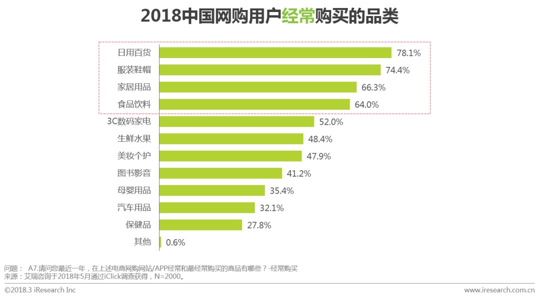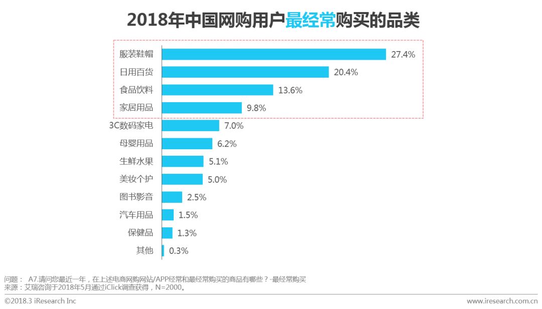 日用百货、服装鞋帽、家居用品及食品饮料为网购用户中经常购买的品类,其中服装鞋帽是最常购买的品类,占比为27.4%;其次为日用百货和食品饮料,占比分别为20.4%和13.6%。