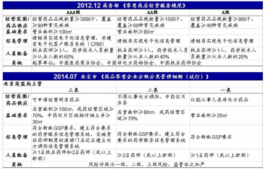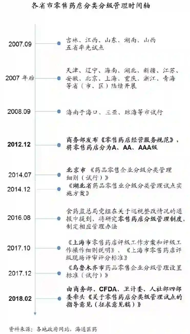 2)2012-2017 各地陆续推行阶段。 2012年, 国家商务部秩序司在《零售药店经营服务规范》中提出,对药店实行分级管理,由高到低为:AAA级、AA级、 A 级。 随后各地陆续推行, 2014年,北京、湖北等地相继发布分级分类管理细则。2016年8月,国家食药监局党组在关于巡视整改情况的通报中提到,将研究零售药店分级管理制度,制定相应管理办法。