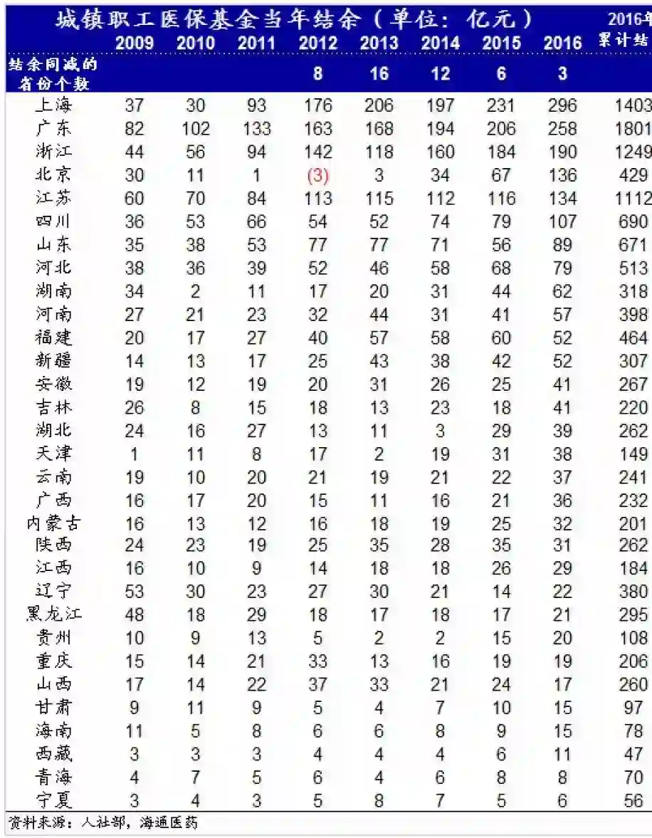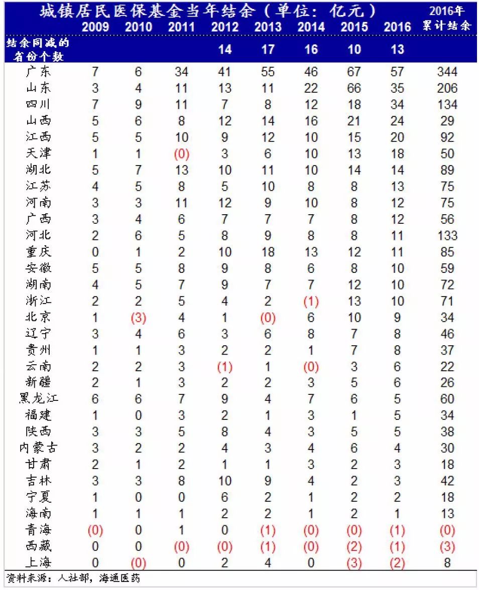 2015-16年以来职工及居民医保资金控费较有效,2012-2016年分省职工医保资金当年结余同比减少的省份数量分别为:8、16、12、6、3个;分省居民医保资金当年结余同比减少的省份数量分别为:14、17、16、10、13个。