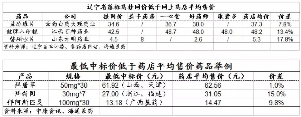 价格倒挂药品包括部分落标药及最低中标价品种。 随着招标降价和药品零加成等政策推进, 而药店中高位SKU份额持续扩大,有些药品于药店的零售价高于医院,价格倒挂现象凸显,包括药企直接弃标转投药店渠道的落标药,及某些省份的最低中标价品种。如2017年7月辽宁省58个弃标品种为例,其中3个外用/口服品种的网上药店均价高于挂网价 10%左右, 5个外用/口服品种的价差更高达20%以上;而据中康资讯数据, 拜耳旗下的三大产品拜唐苹、拜新同和拜阿司匹林(国内年销售额近百亿)的药店平均售价亦高于最低中标价。