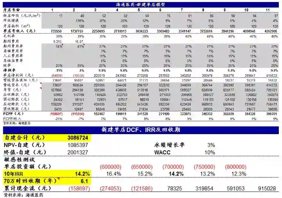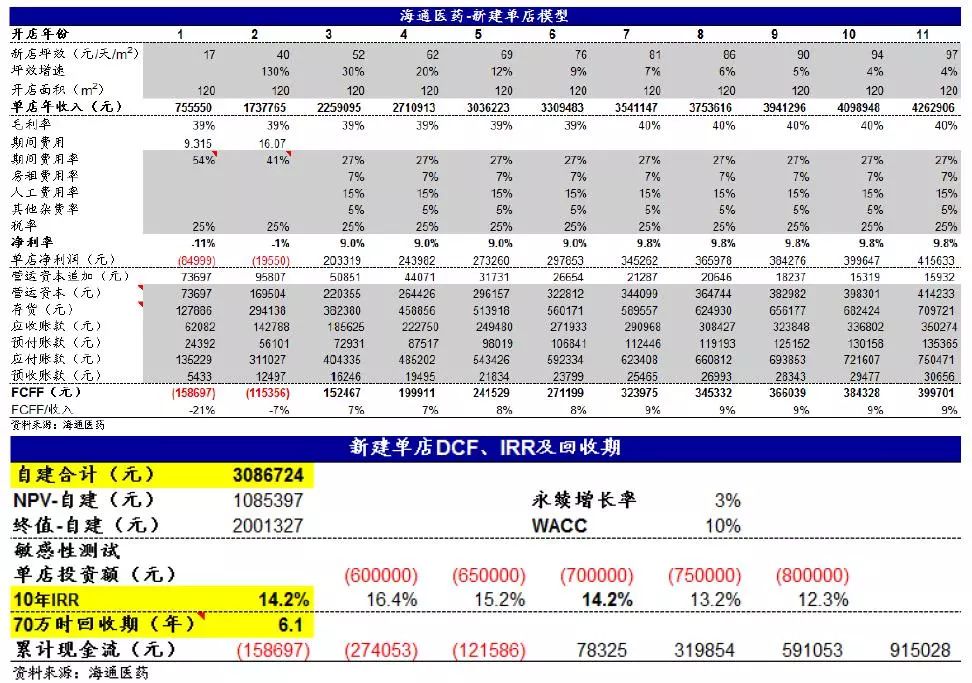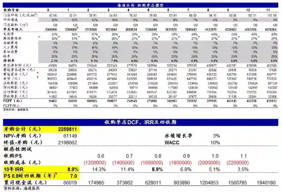 结论: 通过模型测算,新建店10年IRR为14%,回收期6年(单店投资额70万);并购店10年IRR为9%,回收期7年( 收购当年PS=0.8)。