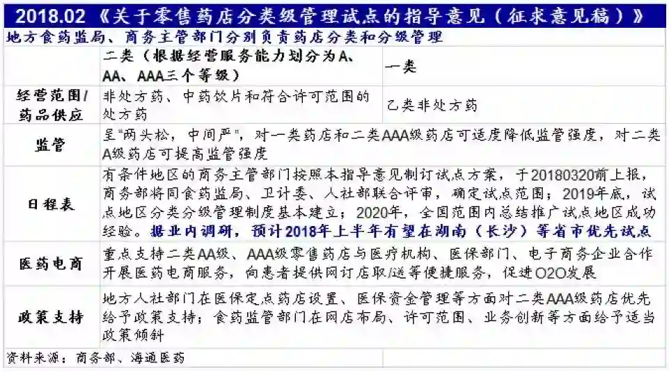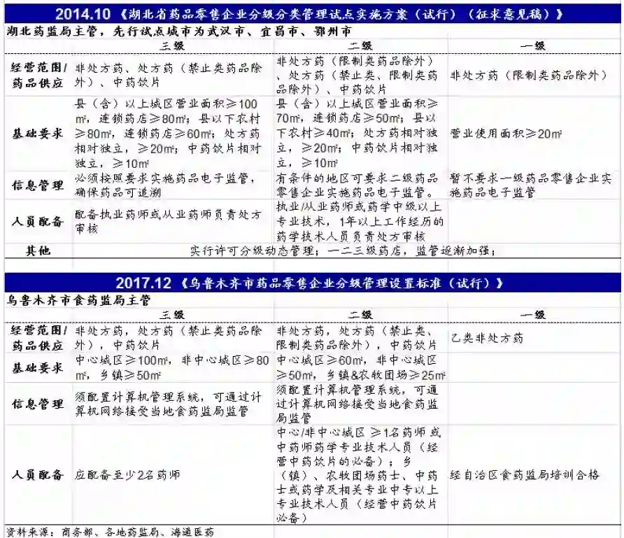 3) 2017 年之后阶段。 2017年底,商务部市场秩序司和国家食药监局药化监管司起草了《征求意见稿》,并向湖南、湖北、河北等十余个省份的商务主管部门征求意见,各方意见已于 11 月 22 日前反馈至商务部。 2017年10-12月,上海、乌鲁木齐相继颁布《上海市零售药店评级工作方案和评级工作操作细则说明》、《乌鲁木齐市药品零售企业分级管理设置标准(试行)》。 2018年2月,商务部、CFDA、卫计委、人社部四部委牵头起草的《关于零售药店分类级管理试点的指导意见(征求意见稿)》 向全国各省市自治区的分管部门征求意见。