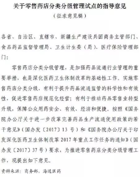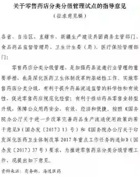 而此次为商务部、食药监局联合卫计委、人社部牵头,地方食药监局、商务主管部门分别负责药店分类和分级管理,意见稿与2017年2月《国务院办公厅关一进一步改革完善药品生产流通使用政策的若干意见》 中“推进零售药店分级分类管理, 提高零售连锁率”形成呼应, 使各地分开试点真正走近全国范围“有法可依”阶段, 且提出“及时公示分类分级结果,接受社会监督,公示无异议方可确认结果,并根据结果向零售药店核发标识牌, 表明类别和级别”。