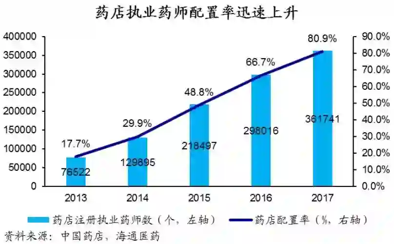 国内药店行业的专业服务水平仍有待提高。 2017年12月注册于社会药房的执业药师为36.17万人,以1人/店来测算,执业药师配置率为 81%。然而与医院机构相比,药店的专业化服务水平仍不够,据问卷调查分别有41%和25%的消费者在药店购买Rx和OTC时认为服务不够专业( 数万人样本);仅60%的连锁药店配置最基本的管理系统,会员精细化及仓储管理系统等在药店配置覆盖率更低。 药店的专业服务水平如执业药师服务、 信息化管理等仍有待提高,以承接更大规模的处方外流。
