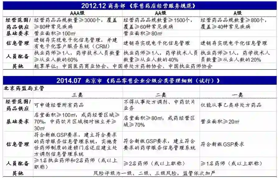 2012版商务部标准将零售药店划分为 A、AA、AAA 级,并未限定非处方药/非处方药经营范围, 而对营业面积、标志图案、药品供应能力、人员配备与培训、药学服务能力给出了参考标准,规定药店经营药品品规数量和覆盖常见疾病分别为 AAA 级、3000个,80种;AA级、1500个、60种;A级、800个,40种。 后期北京、湖北、乌鲁木齐等省市标准,与早期五省药监局版一致限定(非)处方药经营范围,且在药店信息管理上对各级药店有相应要求。
