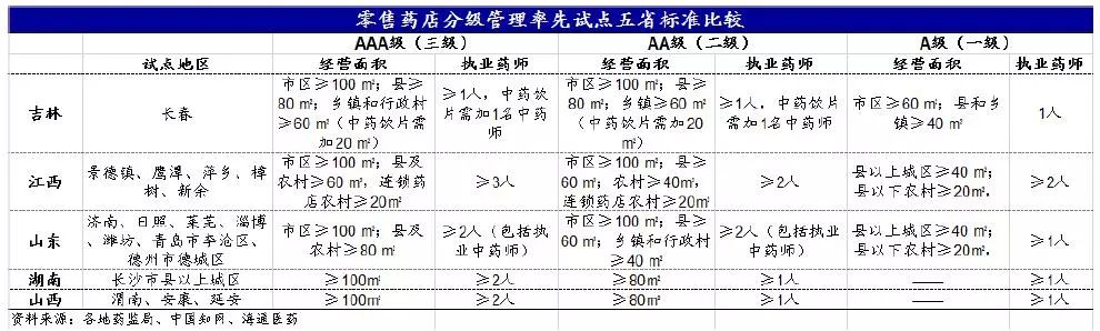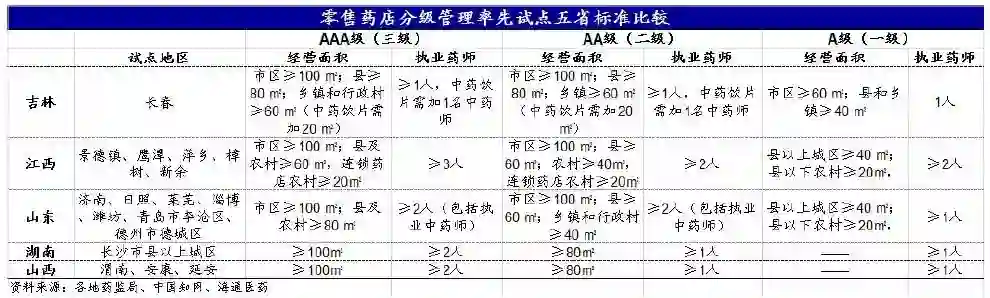 早期率先试点的五省标准类似, 均是按照药学技术人员服务能力等经营条件,将药品零售企业共划分为一、二、三级。 其中,一级药品零售企业的只能经营乙类非处方药;二级药品零售企业可以经营非处方药、处方药(禁止类、限制类药品除外)、中药饮片;三级药品零售企业的经营类别更广,分别为非处方药、处方药(禁止类药品除外)、中药饮片,这也是后来各省试点的雏形。且一级至三级药店的营业面积和执业药师配备要求逐渐升高。