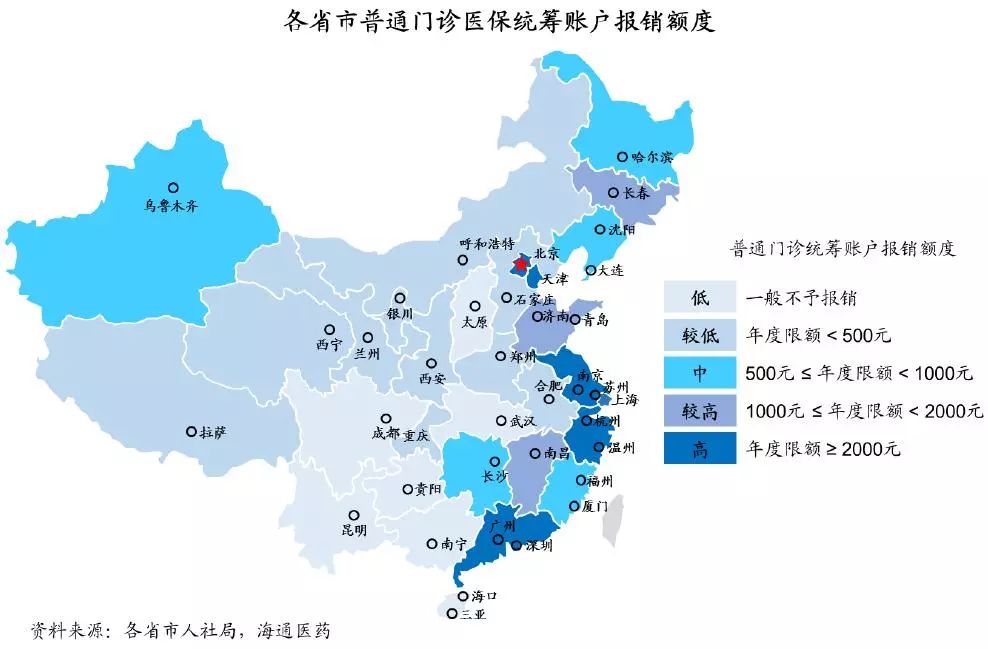 3)普通门诊统筹。即通常意义上的门诊统筹, 主要针对普通门诊疾病,也按照费用划分,但起付线较低或无起付线, 城乡居民医保(含新农合)普遍建立。深圳市在早期即在农民工医保提供门诊统筹待遇,且强制基层首诊。当前各地的门诊统筹的报销额度、 报销比例、起付线、封顶线等各异, 东部沿海地区普通门诊统筹的报销额度及封顶线更高,例如上海未设定报销限额,北京年度限额为2万元; 惠州年度限额800元,长沙600元; 成都、昆明则一般不予报销。