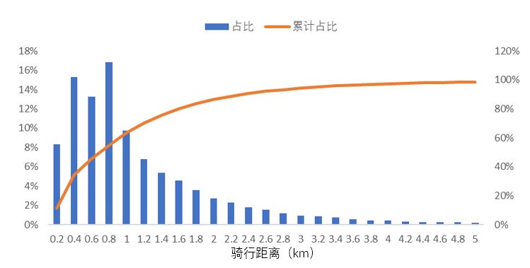 对某个共享单车品牌一天中移动超过100m的单车数据进行分析,骑行总量为4.3万次,车辆日均骑行次数为3.9次/辆。骑行距离方面,平均单次骑行距离约1.1公里,约82%的骑行出行距离在1.6公里以内,其中1公里以内的出行占比约63.4%。这也充分反映了共享单车对城市交通的“最后一公里”发挥着重要作用。从骑行时耗来看,平均单次骑行时间约9.8分钟,其中4分钟至6分钟占比最高,约24%。