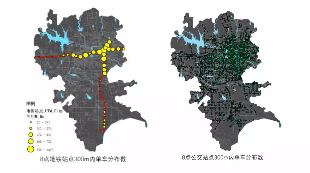此外自行车交通有效拓展了公共交通服务范围,从与小汽车出行可达范围对比图可以看出:共享单车的引入,使得公共交通站点特别是轨道交通站点沿线的公共交通与自行车组合优势范围得到明显的延伸。在主城区与滨湖新区、高新区、科学城等外围片区连接上,相比于小汽车出行,竞争优势明显。