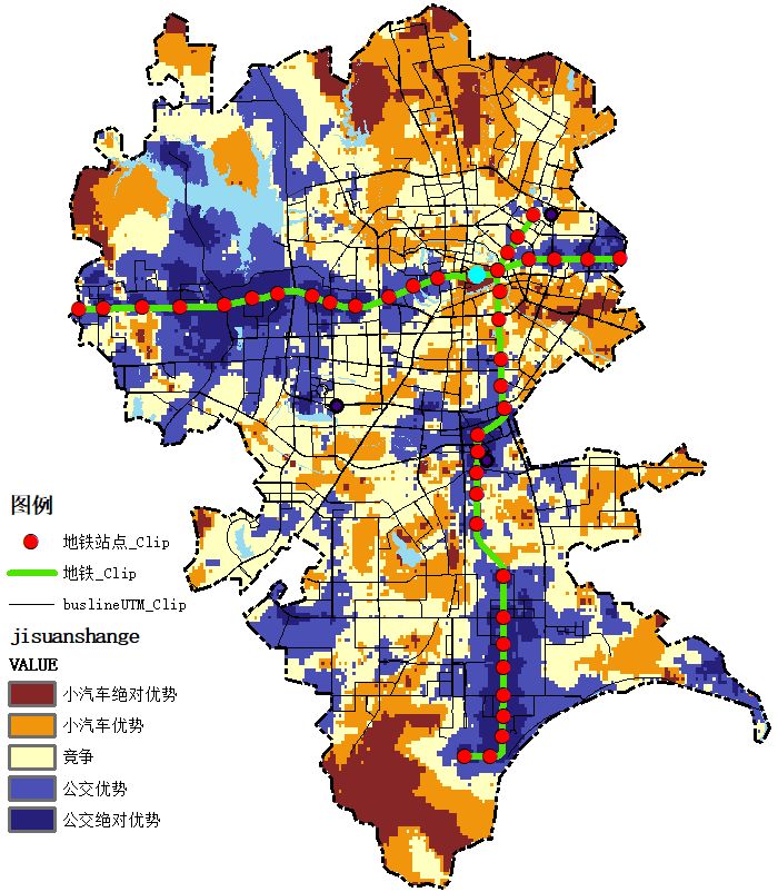 图9:合肥公共交通与小汽车可达范围竞争关系分析图