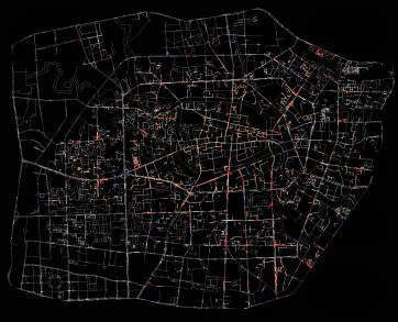 从单车在城市道路的分布情况来看,不论夜间还是工作时间,在二环内,共享单车在主干路、次干路甚至支路上均有较多分布,二环外则主要沿城市干道沿线分布,支小路分布相对较少。
