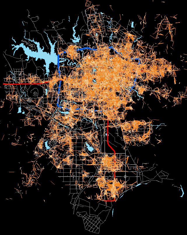 从骑行轨迹分布来看,轨道交通站点周边依然是骑行的主要分布区。在核心区的轨道站点周边,出行需求来自轨道交通站点周边的各个角落,并呈放射性发散,站点周边不论主干路还是支小路都有大量的骑行需求。而在城市外围地铁站周边,骑行主要分布在非机动车通行条件较好的干路上。