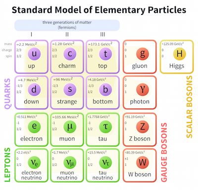 上表中所示的粒子,连同爱因斯坦的引力理论,解释了物理学中所有的观测结果,只有少数例外(大部分在天文学中)。特别是,我们在日常生活中遇到的所有事物最终都是由这些粒子相互作用产生的。单独的相互作用是相当简单的,但是把它们放在一起就会增加我们观察到的事物的复杂性,就像一个复杂的机器,其中每个组件都根据简单的规则进行自己的行为。