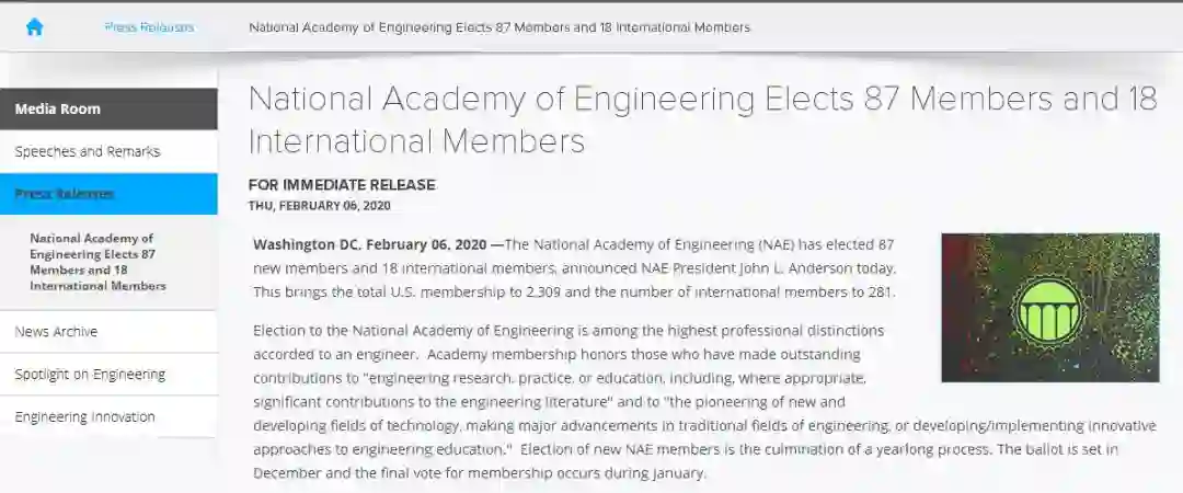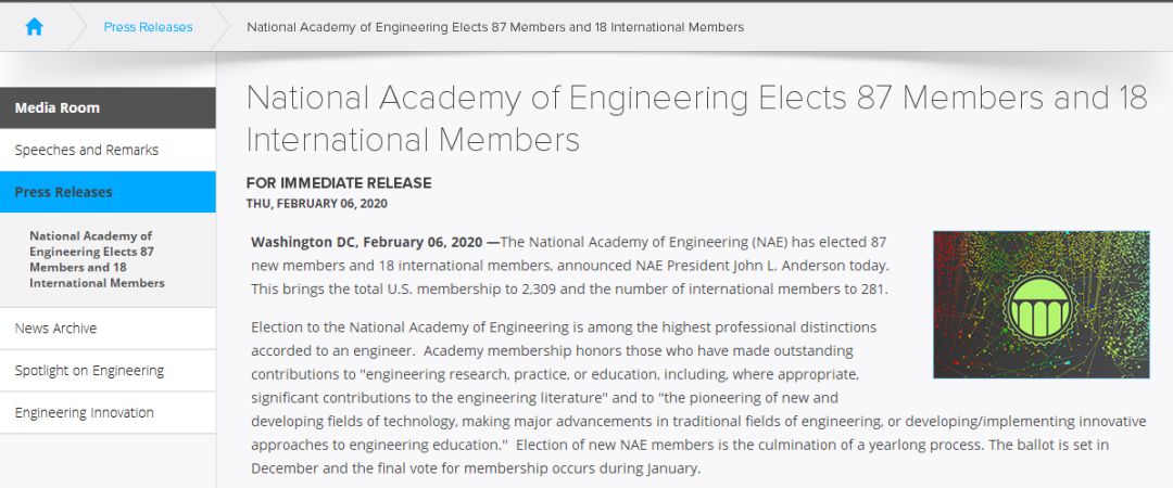 美国华盛顿当地时间 2月6日,美国国家工程院(NAE)主席 John L. Anderson亲自公布了本年度美国国家工程院院士入选名单,包括 87名新院士和18名国际院士。