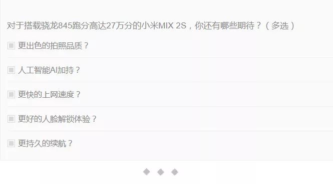 在小米公号预热文文末,附有投票表格——对于搭载骁龙845跑分高达27万分的小米MIX 2S,你还有哪些期待?选项包括更出色的拍照品质、人工智能AI加持、更快的上网速度、更好的人脸解锁体验、更持久的续航。雷锋网据此猜测,小米MIX 2S或将在摄像、AI、内存、人脸解锁、以及电池等方面发力,但是否会加入屏下指纹识别,尚未可知。