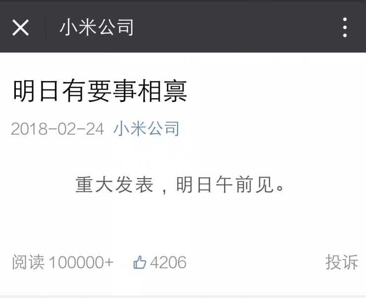 2月24日,小米公司公号发布题为《明日有要事相禀》的文章称,“重大发表,明日午前见”;2月25日11点,小米新浪微博与微信公众号相继发布揭秘文章——《小米MIX 2S 搭载骁龙845,3月27日见!》预热了一波3月27日的新品发布会。一番悬念挑逗下来,只能说,小米营销套路深。