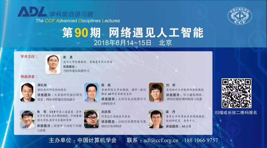当网络遇见人工智能,是否会掀起网络技术研究的新高潮?给网络技术研究者会带来什么机遇与挑战?本次CCF前沿讲习班的与会者,不仅能聆听网络系统及人工智能领域海内外著名学者的精彩报告,还有机会向讲者分享自己的研究工作并得到讲者的指导。