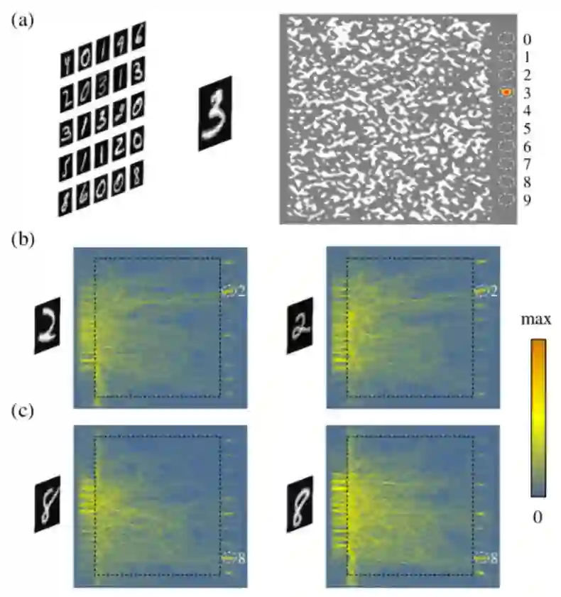 图丨玻璃 AI 的原理。(a)传统的人工神经网络架构,其中信息只能向前传播; (b)玻璃 AI 系统的光学神经网络,采用通过具有线性和非线性散射体的光进行神经计算。(来源:喻宗夫)图丨玻璃 AI 的工作过程。(a)系统经过训练以识别手写数字,输入波将图像编码为光能强度分布。(b)数字 2 的两个样本。 可以看出,两个 2 的光能场分布不同,但是它们被识别为 2。(c)两个 8 的光能场分布不同,它们都被识别为 8。(来源:喻宗夫)