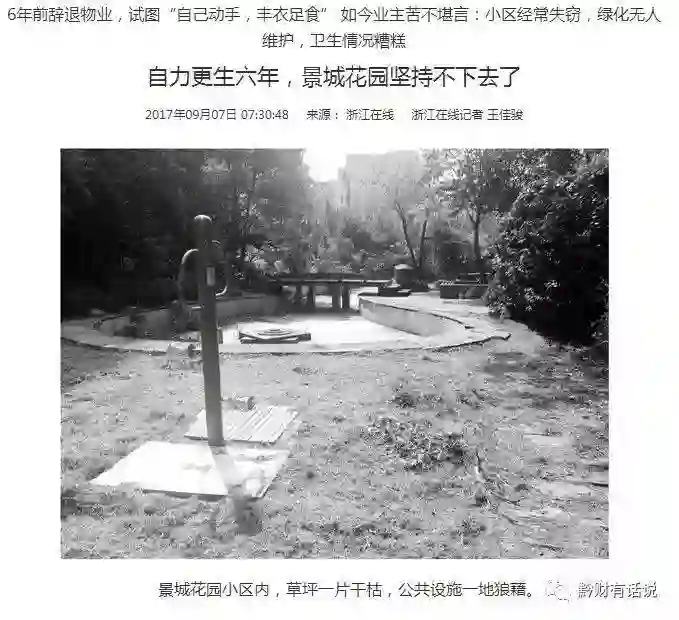 市面上还真有业主自我管理的例子。来看一个《钱江晚报》的新闻,这个小区的位置很好,房龄15年,以大户型为主,建成时算是蛮高档的。从2011年开始,这个小区开始尝试自我管理,最后证明是条死路: